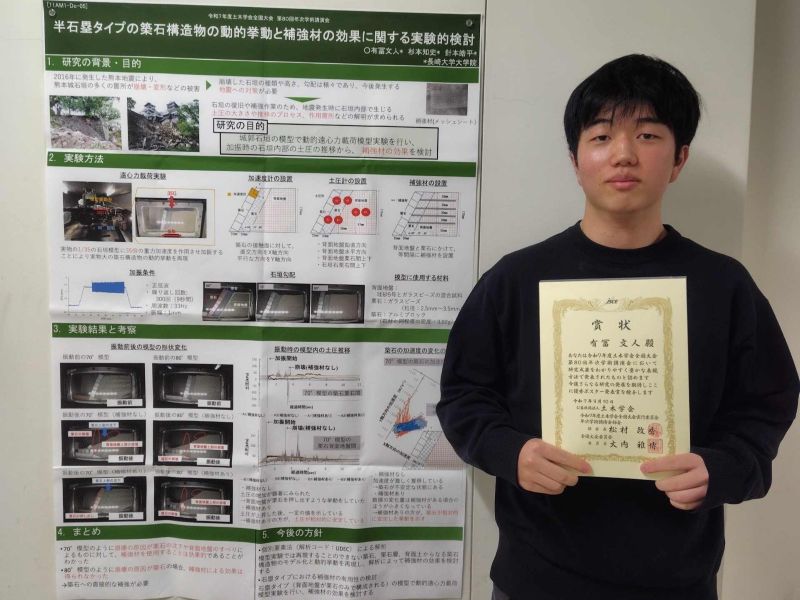 土木学会全国大会で優秀ポスター発表賞を受賞しました!2025.12.15総合生産科学研究科 博士前期課程 環境レジリエンス分野(工学系)1年の有冨文人さんが、9月に熊本城ホールで開催された「土木学会全国大会第80回年次学術講演会」において優秀ポスター発表賞を受賞しました。続きを読む >>