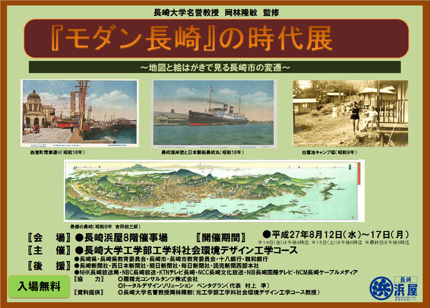 長崎市は今年、被爆70周年、路面電車開通100周年を迎えます。これを記念して、明治後期から昭和初期の時代に焦点を当て、岡林隆敏長崎大学名誉教授(社会環境デザイン工学コース元教授)による長崎市の都市形成史(都市基盤整備と観光)の研究成果をまとめたパネル展を、長崎浜屋にて開催します。期間は、8月12日(水)~17日(月)となっております。入場は無料です。ぜひこの機会に、被爆する前の繁栄したモダン都市長崎の姿をご覧ください。